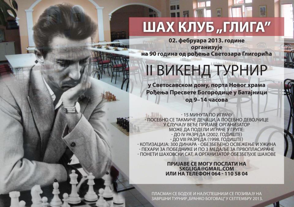 У недељу 03.02.2013. год. одржан је у порти Храма Рођенја Пресвете Богородице у Батајници II Викенд турнир на којем су се млади шахисти такмичили у три категорије, дечаци до 2002. годишта, дечаци до 1998. годишта и девојчице до 1998. годишта (девојчице нису биле подељене у две групе због мањег одзива, било је укупно 15 девојчица али је конкуренција ипак била врло јака). II Викенд турнир је био посвећен и Светозару Глигорићу јер смо обележили 90. година од рођена прослављеног велемајстора по коме наш клуб носи и име.